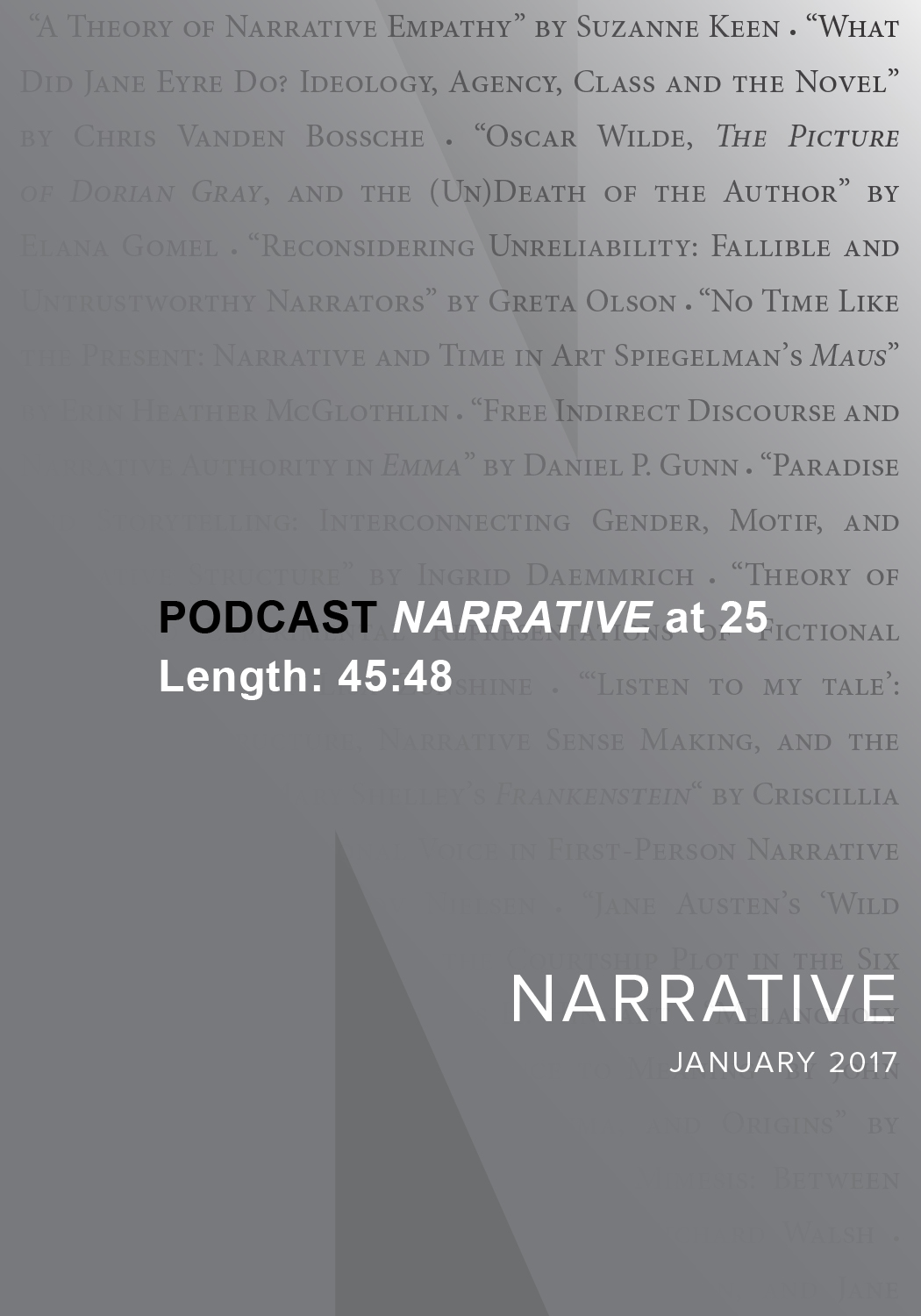 Narrative publishes essays on narrative theory, essays on narrative and its relations to other modes of discourse, and essays of practical criticism based in diverse theoretical modes. The editors especially welcome submissions combining theoretical investigation and practical criticism. “Narrative” for us is a category that includes the novel, narrative poetry, history, biography, autobiography, film, and performance art. Because of our diverse audience, we are not interested in essays whose main contribution is to offer a new reading of a narrative by Author X. However, we do welcome new readings that are linked with some theoretical exploration or that are of interest in some other way to those who are not specialists in Author X.